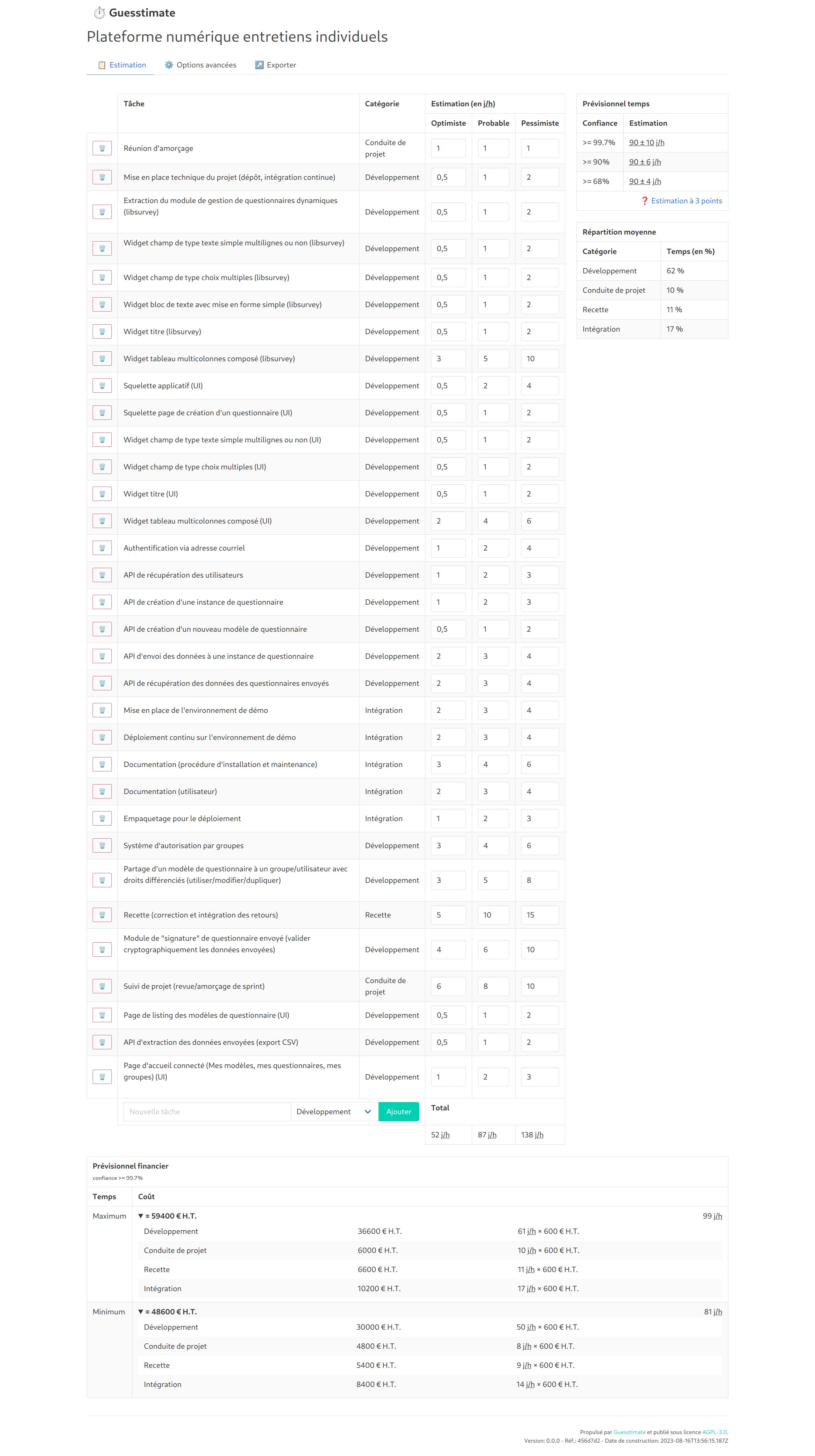 - La création d’une synthèse claire du temps estimé, avec une ventilation par catégorie de tâches ;