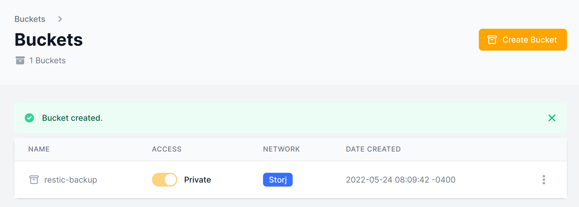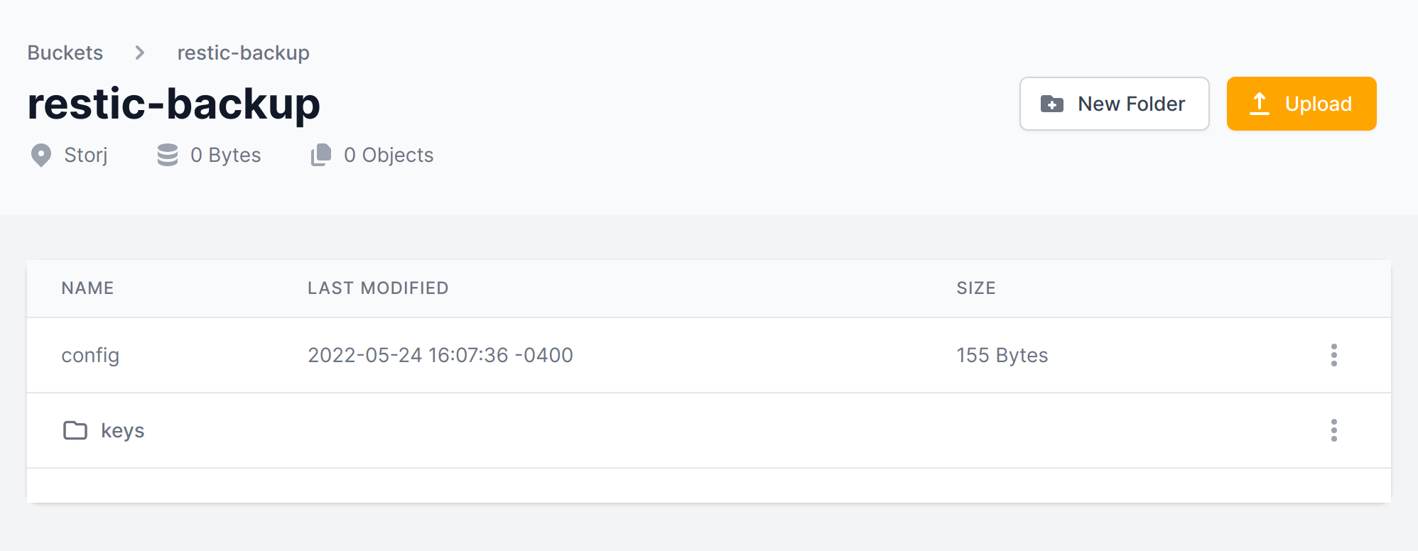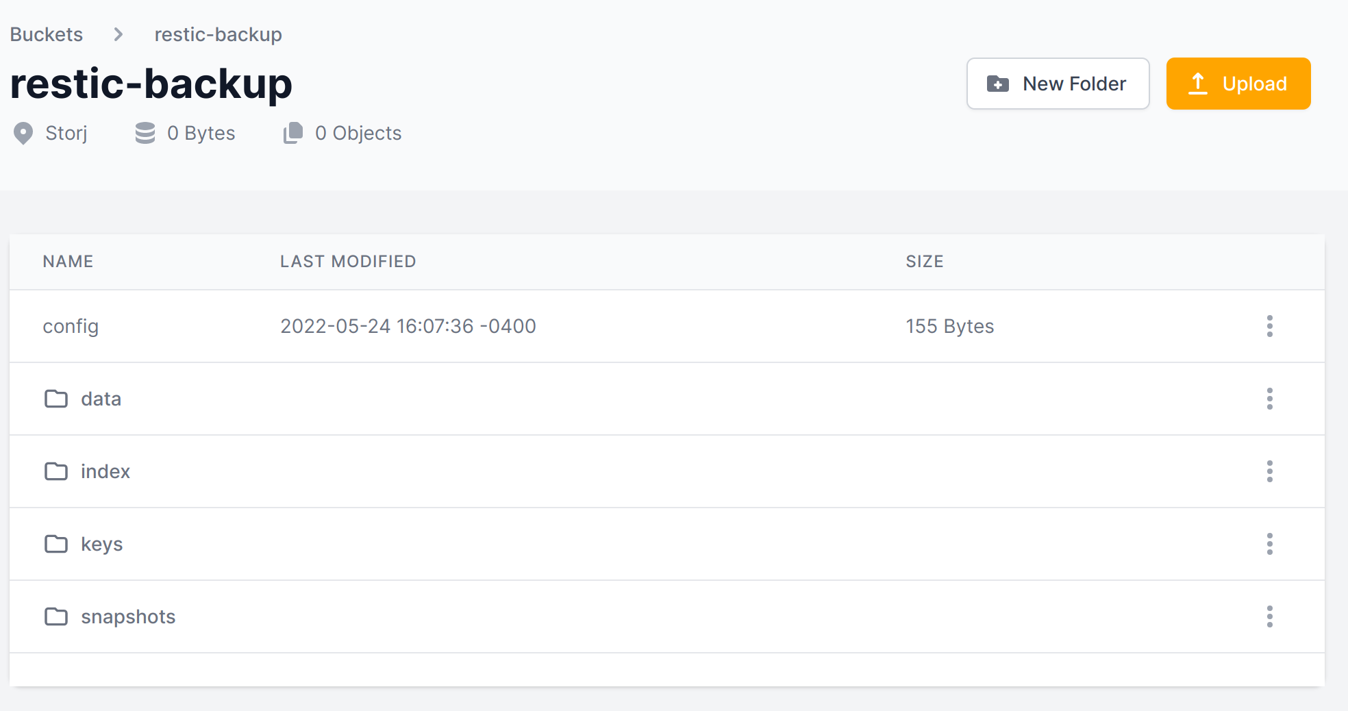 root@7974eceeaf59:/# restic init created restic repository 332fbe42d2 at s3:https://s3.filebase.com/restic-backup Please note that knowledge of your password is required to access the repository. Losing your password means that your data is irrecoverably lost.Votre dépôt est initialisé ! Si vous accéder au tableau de bord sur Filebase, dans votre bucket vous devriez avoir quelque chose ressemblant à l’image suivante.